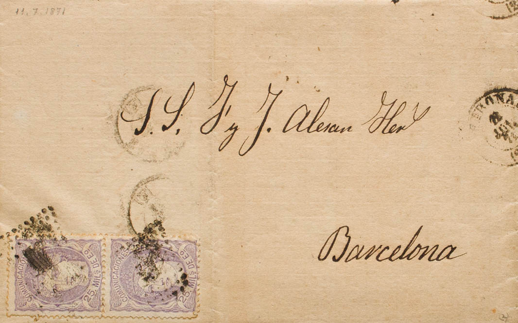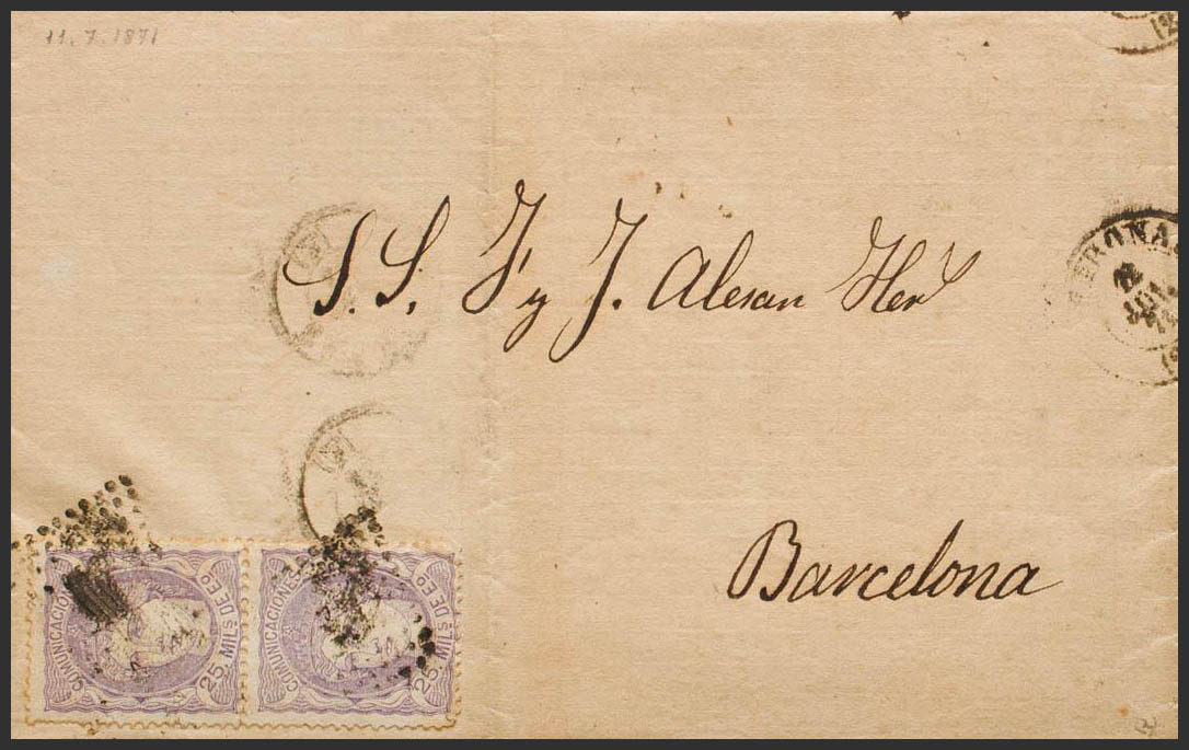 106(2). 1871. 25 lilac mils, two stamps. GIRONA to BARCELONA. MAGNIFICENT AND UNUSUAL COMBINATION TO COMPLETE THE SINGLE SHIPPING RATE. Ex-Blight.