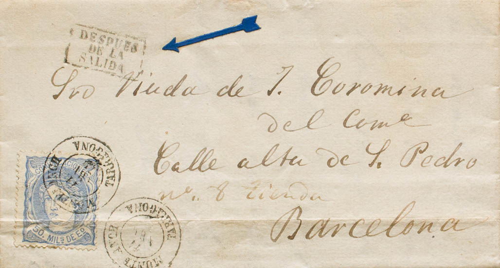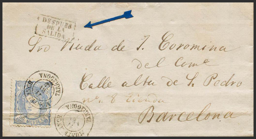 107. 1871. 50 mils overseas (file fold). MONTBLANCH to BARCELONA. Postmark MONTBLANCH / TARRAGONA and on the front mark DESPUES / DE LA / SALIDA. BEAUTIFUL AND RARE. Ex-Blight.