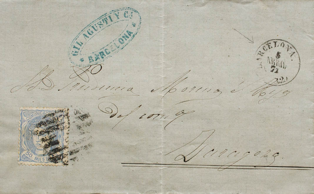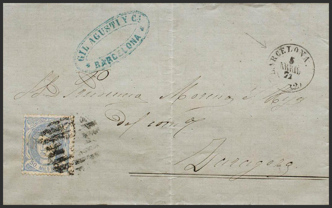 107. 1871. 50 mils overseas. BARCELONA to ZARAGOZA. On the front date stamp BARCELONA / (2), with the full month of APRIL. MAGNIFICENT AND EXTREMELY RARE, NO MORE THAN THREE KNOWN ACCORDING TO TIZON, TORT DESCRIBES IT AS EXTREMELY RARE AND INDICATES IT WITH THE Nº368. Ex-Blight.