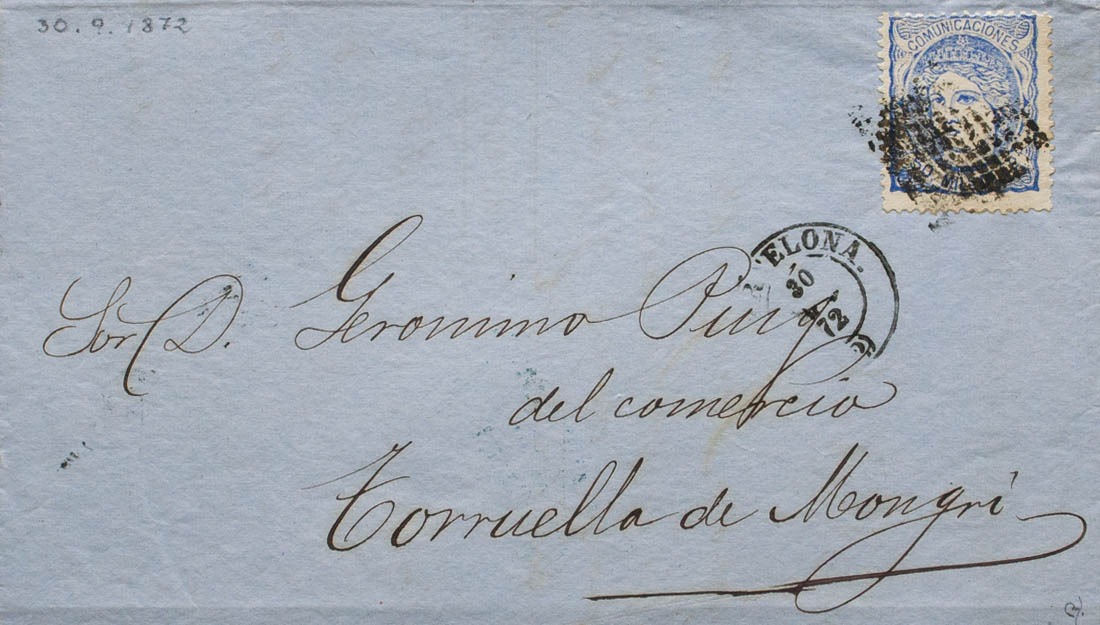 107. 1872. 50 mils overseas. BARCELONA to TORROELLA DE MONTGRI. On the front date BARCELONA / 30-SEP-72 / (2). MAGNIFICENT AND RARE CIRCULATED THE LAST DAY OF CIRCULATION. Ex-Blight.
