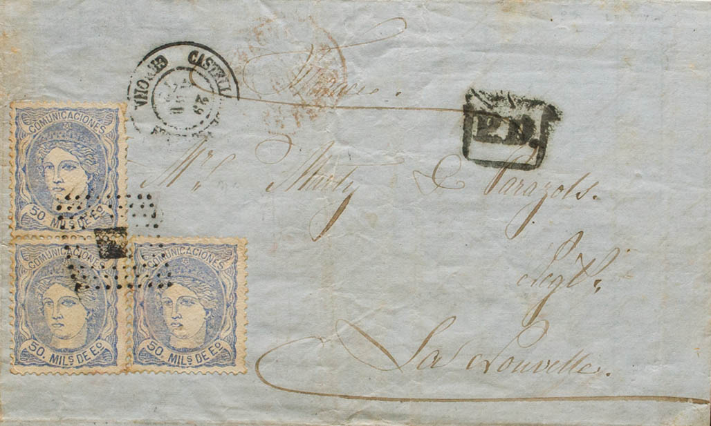 107(3). 1872. 50 mils overseas, three stamps. PORT DE LA SELVA (GERONA) to LA NOUVELLE (FRANCE). On the front dater CASTELLON DE AMPURIAS / GERONA. MAGNIFICENT AND UNUSUAL COMBINATION TO COMPOSE THE RATE OF 150 MILES TO FRANCE. Ex-Blight.
