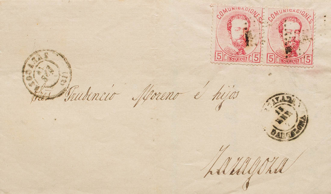 118(2). 1873. 5 rose cts, two stamps. EQUAL TO ZARAGOZA. MAGNIFICENT AND RARE COMBINATION OF POSTAGE OF TWO STAMPS OF 5 CTS TO COMPLETE THE RATE OF 10 CTS. Ex-Blight.