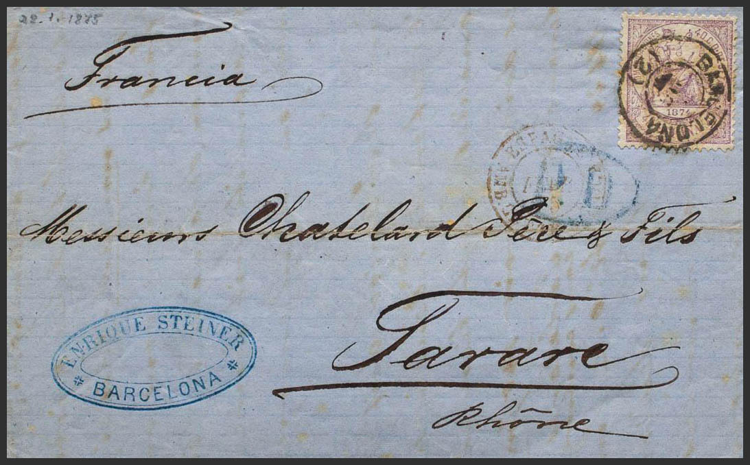 148. 1875. 40 cts violet. BARCELONA to TARARE (FRANCE). Postmark BARCELONA / (2). MAGNIFICENT. Ex-Blight.