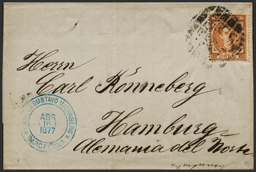 177. 1877. 25 chestnut cts. BARCELONA to HAMBURG (GERMANY). MAGNIFICENT. Ex-Blight.