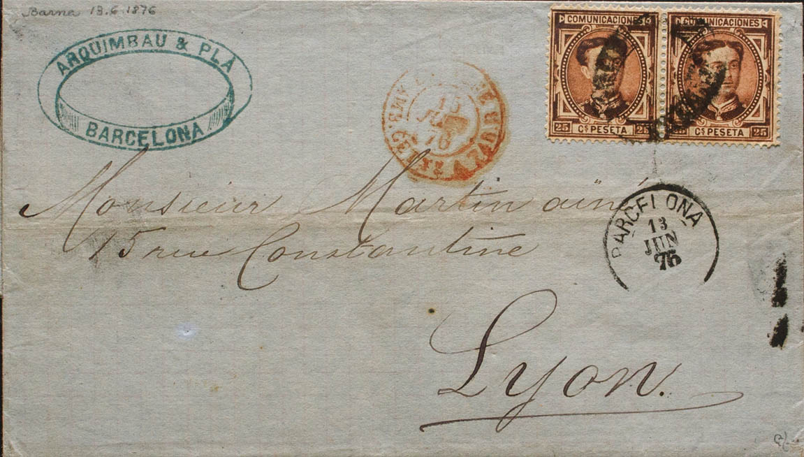 177(2). 1876. 25 chestnut cts, two stamps. BARCELONA to LYON (FRANCE). Postmark BARCELONA / FRANCO. MAGNIFICENT AND VERY RARE. Ex-Blight.