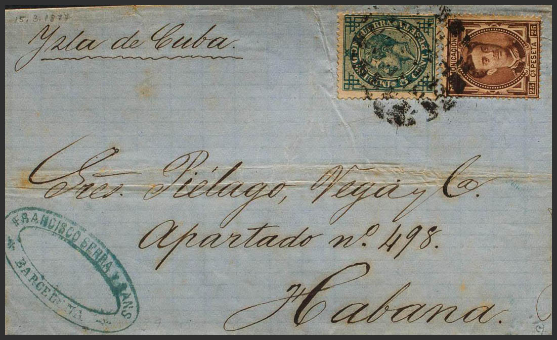177, 183. 1877. 25 cts chestnut and 5 cts green. BARCELONA to HAVANA (CUBA). MAGNIFICENT. Ex-Blight.