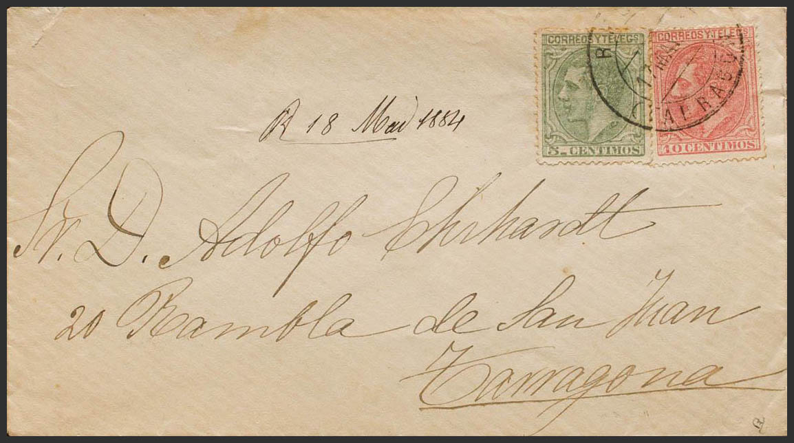 201, 202. 1884. 5 cts green and 10 cts pink. REUS to TARRAGONA. Postmark REUS / (TARRAGONA). MAGNIFICENT AND UNUSUAL COMBINATION. Ex-Blight.