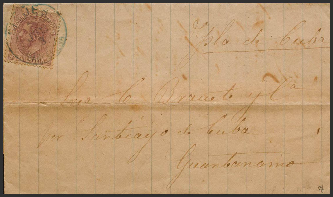 211. 1883. 30 cts lilac. SITGES to GUANTANAMO (CUBA). Clover date postmark SITJES / BARCELONA, in blue. MAGNIFICENT AND RARE. Ex-Blight.