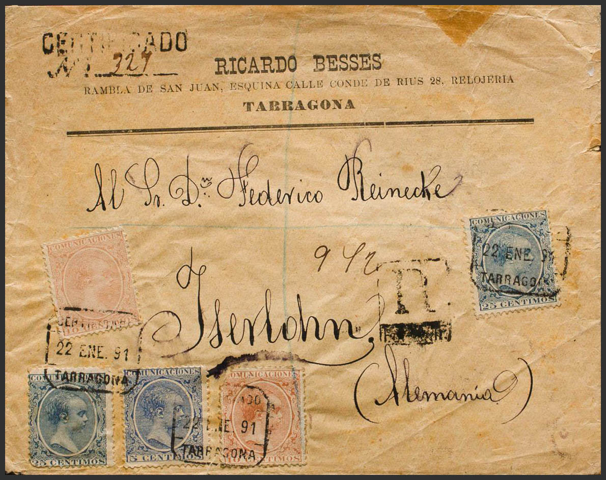 215, 217(2), 221(2). 1891. 5 cts blue, 10 cts yellow chestnut, two stamps (one with minor defect) and 25 cts blue, two stamps. Certificate from TARRAGONA to ISERLOHN (GERMANY). On the back arrival. BEAUTIFUL AND UNUSUAL POSTAGE COMBINATION. Ex-Blight.