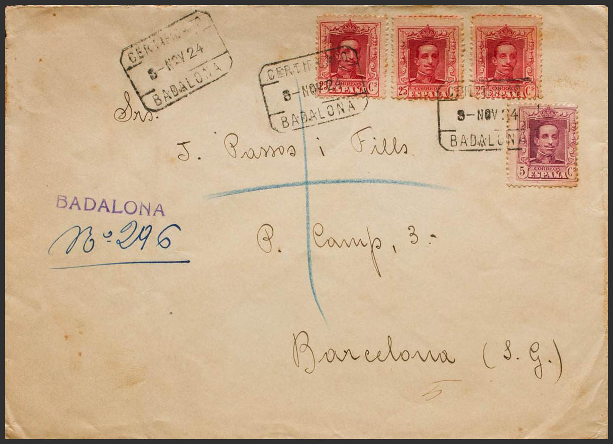 311, 317(3). 1924. 5 cts lilac and 25 cts carmine, three stamps. Certificate from BADALONA to BARCELONA. On the back arrival. MAGNIFICENT. Ex-Blight.