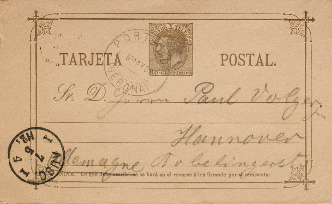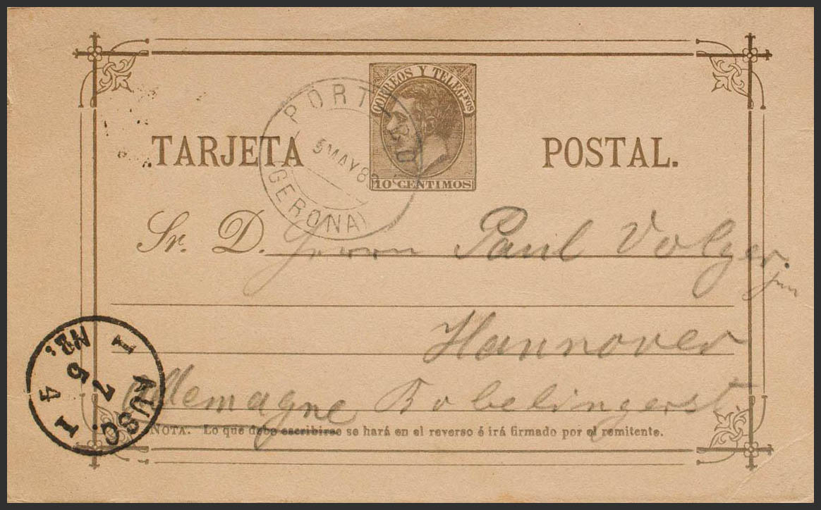 EP11. 1883. 10 cts violet gray Entire envelope Postcard from PORT BOU to HANNOVER (GERMANY). Postmark PORT-BOU / (GERONA) and arrival on the front. MAGNIFICENT AND RARE, ACCORDING TO TIZON IT IS THE FIRST KNOWN DATE IN WHICH THIS ADMINISTRATION USES A POSTMARK. Ex-Blight.