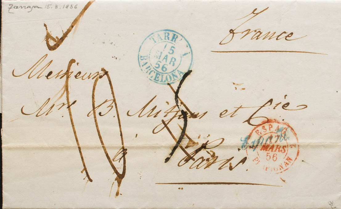 1856. TARRASA to PARIS. On the front dater TARRASA / BARCELONA (Type I), in blue and French porting "5" rectified to "10", due to the double porting rate. MAGNIFICENT. Ex-Blight.