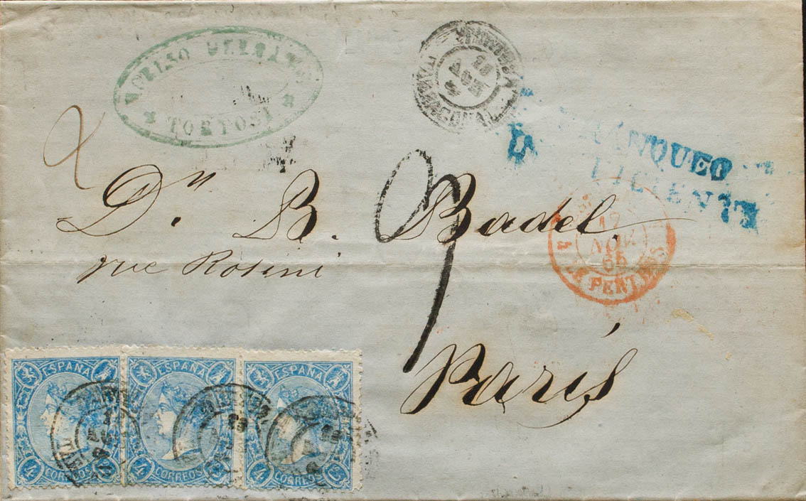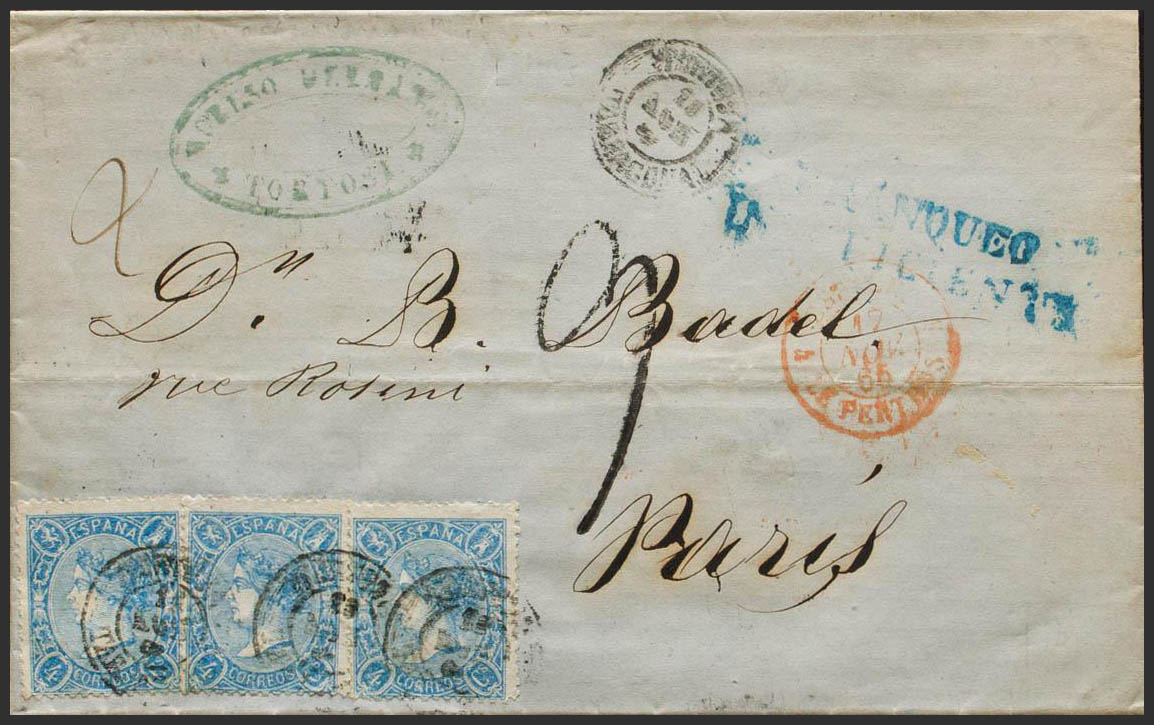75(3). 1865. 4 blue cuartos , three stamps. TORTOSA to PARIS (FRANCE). Postmark TORTOSA / TARRAGONA, on the front mark POSTAGE / INSUFFICIENT, in blue and French postage "9" and handwritten indication "2" to indicate that it is a double postage. MAGNIFICENT. Ex-Blight.