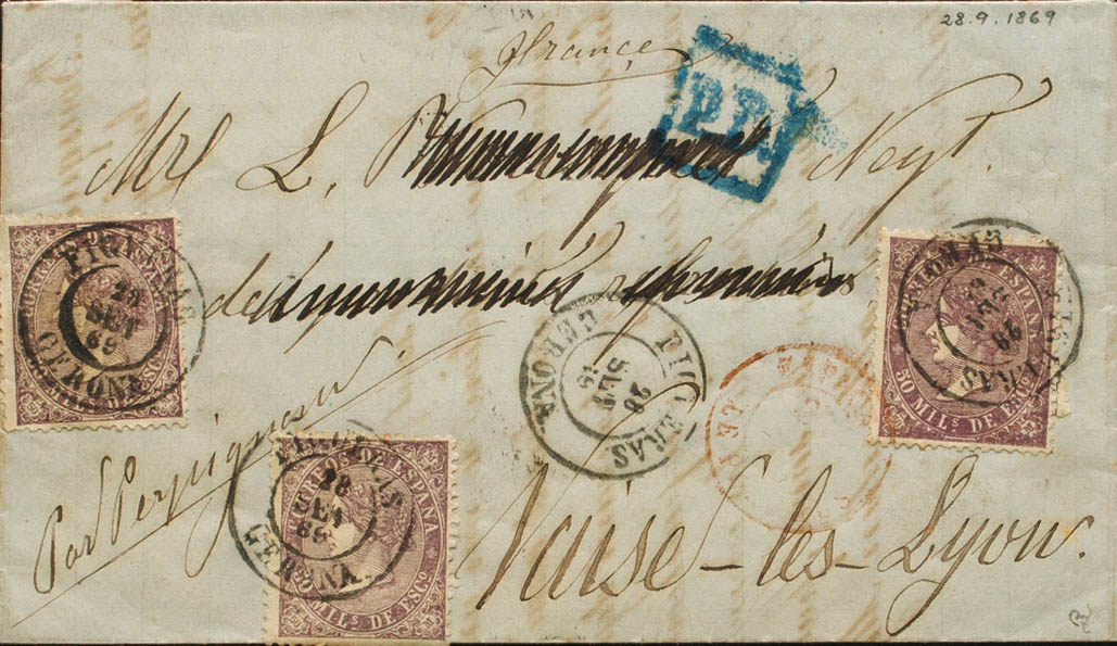 98(3). 1869. 50 mils violet, three stamps. FIGUERAS to LYON (FRANCE). Postmark FIGUERAS / GERONA. MAGNIFICENT AND UNUSUAL COMBINATION OF POSTAGE TO COMPLETE THE FEE OF 150 MILS TO FRANCE. Ex-Blight.