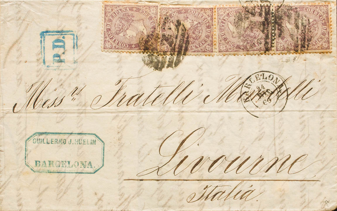 98(4). 1869. 50 mils violet, four stamps. BARCELONA to LIVORNO (ITALY). MAGNIFICENT AND UNUSUAL COMBINATION OF POSTAGE TO COMPLETE THE RATE OF 200 MILS TO ITALY, TRULY SPECTACULAR. Ex-Blight.