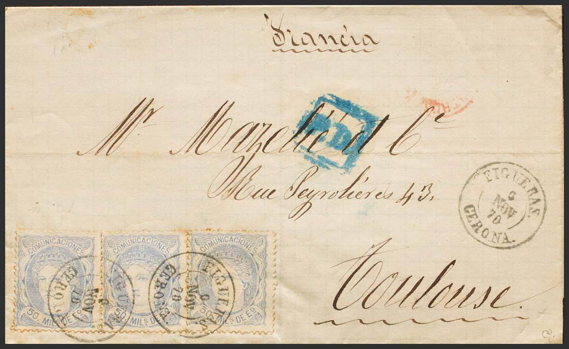 107(3). 1870. 50 blue mils, three stamps. FIGUERAS to TOULOUSE (FRANCE). Postmark FIGUERAS / GERONA. MAGNIFICENT AND UNUSUAL COMBINATION OF POSTAGE TO COMPLETE THE RATE OF 150 MILS TO FRANCE, TRULY SPECTACULAR LETTER. Ex-Blight.