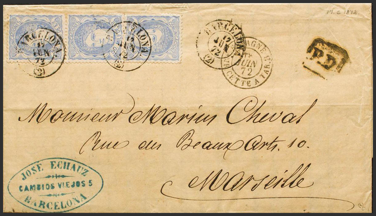 107(3). 1872. 50 mils overseas, three stamps. BARCELONA to MARSEILLE. Postmark BARCELONA / (2). MAGNIFICENT AND UNUSUAL COMBINATION OF POSTAGE TO COMPLETE THE RATE OF 150 MILS TO FRANCE, TRULY SPECTACULAR LETTER. Ex-Blight.