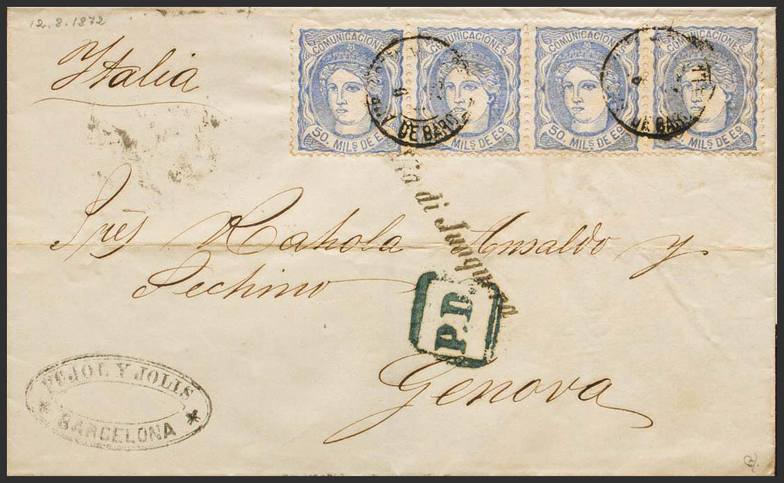 107(4). 1872. 50 mils overseas, four stamps. BARCELONA to GENOA (ITALY). Walking postmark and VIA DI JUNQUERA brand on the front. MAGNIFICENT AND UNUSUAL COMBINATION OF POSTAGE TO COMPLETE THE RATE OF 200 MILS TO ITALY, TRULY SPECTACULAR. Ex-Blight.