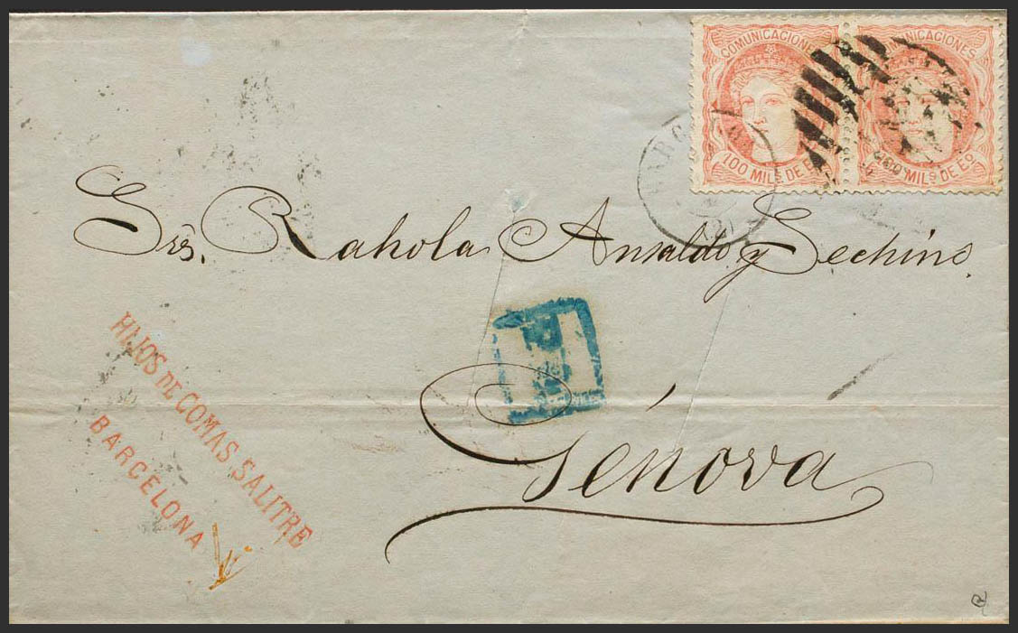 108(2). 1870. 100 mils red chestnut, pair. BARCELONA to GENOVA (in the front disinfection cuts, carried out on arrival due to the yellow fever that devastated Barcelona in 1870). MAGNIFICENT AND EXTREMELY RARE COMBINATION TO MAKE UP THE RATE OF 200 MILES TO ITALY, A TRULY SPECTACULAR LETTER. Ex-Blight.