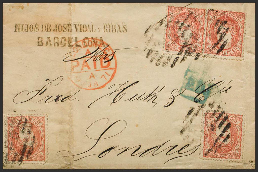 108(4). 1870. 100 red chestnut mils, four stamps. BARCELONA to LONDON (ENGLAND). MAGNIFICENT AND EXTREMELY RARE COMBINATION OF POSTAGE TO MAKE UP THE DOUBLE POSTAGE RATE TO ENGLAND. Ex-Blight.