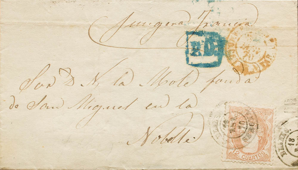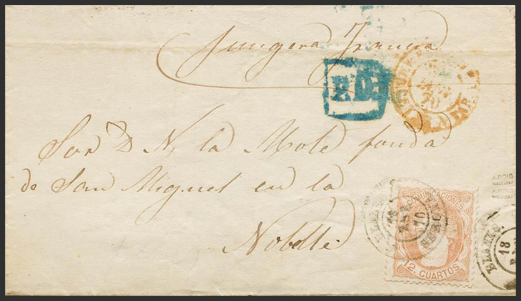 113. 1870. 12- cuartos chestnut. BLANES to LA NOUVELLE (FRANCE). Postmark BLANES / GERONA. MAGNIFICENT. Ex-Blight.