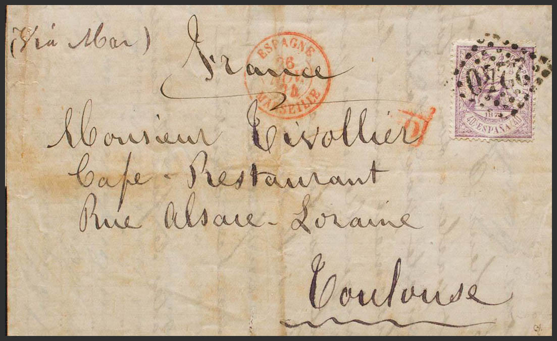148. 1874. 40 cts violet. BARCELONA to TOULOUSE (FRANCE). French postmark "2240", applied in transit through Marseille and on the front handwritten indication "VÃa Mar". MAGNIFICENT. Ex-Blight.