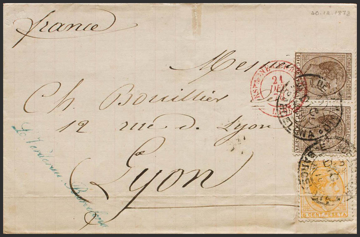 191, 192(2). 1878. 5 cts yellow (file fold) and 10 cts chestnut, pair. BARCELONA to LYON (FRANCE). Postmark E. DE CAMBIO / BARCELONA. MAGNIFICENT AND VERY RARE COMBINATION OF POSTAGE TO COMPLETE THE RATE OF 25 CTS TO FRANCE. Ex-Blight.