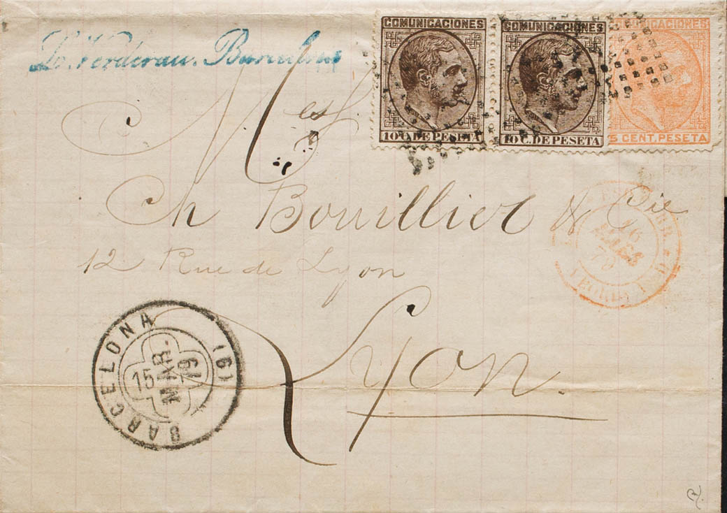 191, 192(2). 1879. 5 cts orange and 10 cts chestnut, two stamps. BARCELONA to LYON (FRANCE). MAGNIFICENT AND VERY RARE COMBINATION OF POSTAGE TO COMPLETE THE RATE OF 25 CTS TO FRANCE. Ex-Blight.