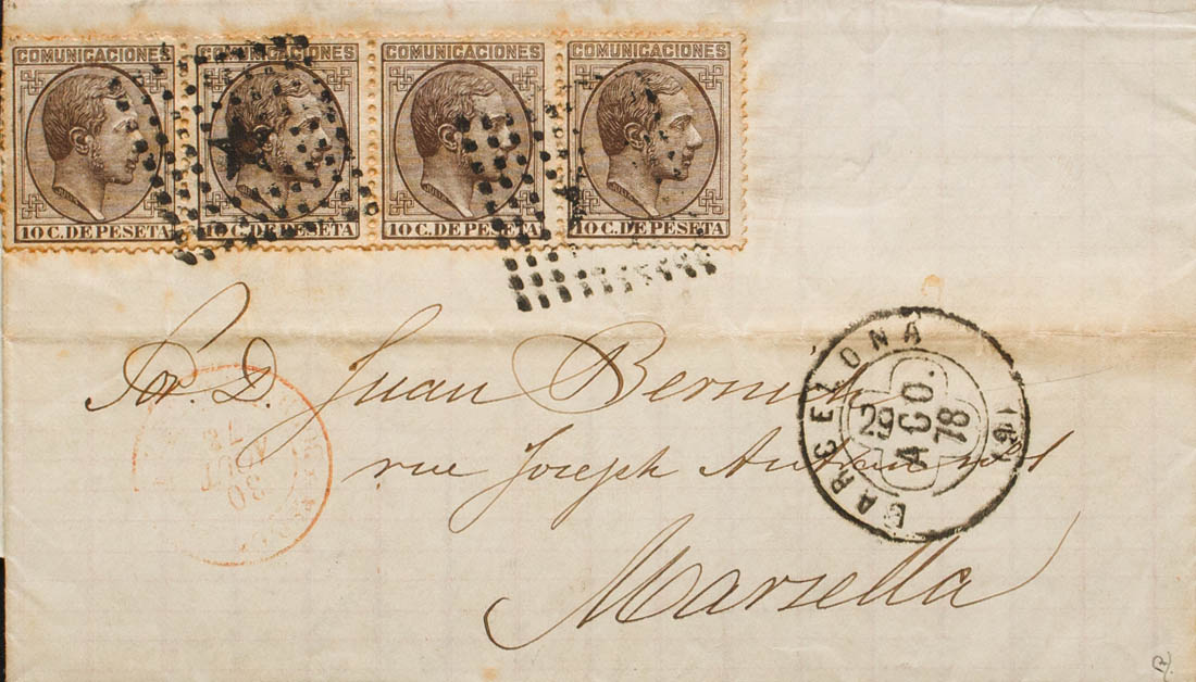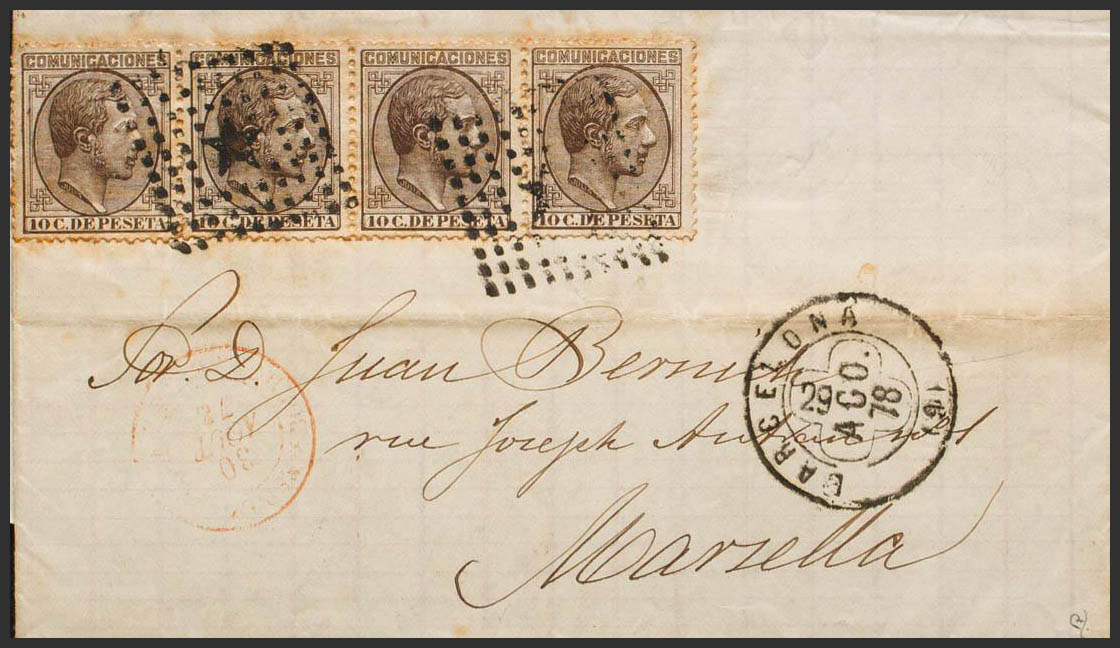 192(4). 1878. 10 chestnut cts, strip of four. BARCELONA to MARSEILLE (FRANCE). MAGNIFICENT AND RARE COMBINATION OF POSTAGE TO COMPLETE THE RATE OF 40 CTS. Ex-Blight.