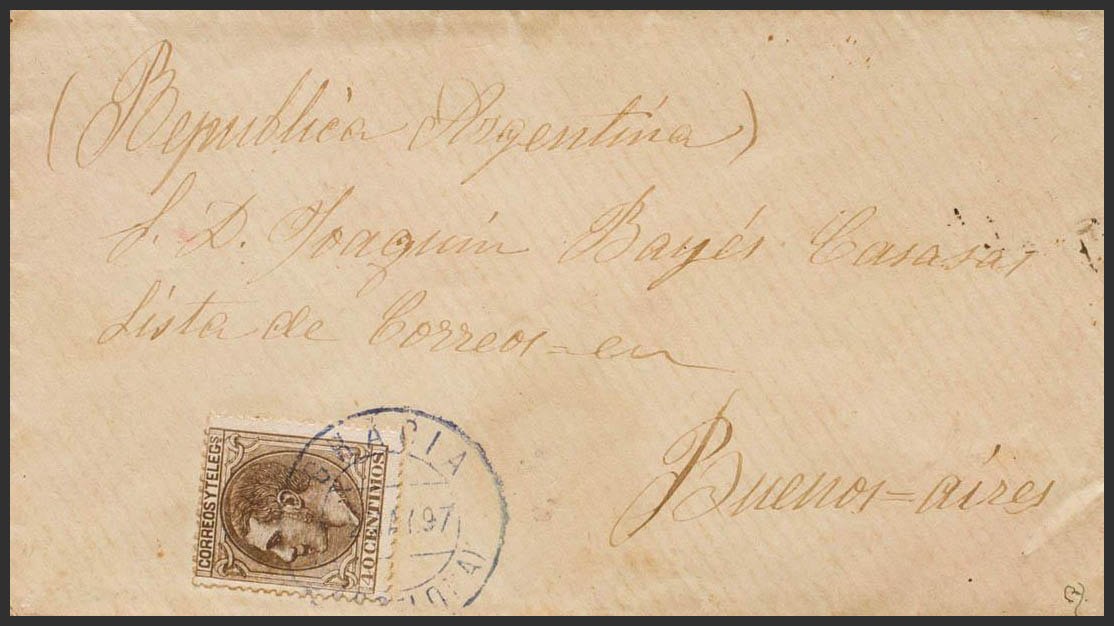 205. 1887. 40 chestnut cts. BARCELONA to BUENOS AIRES (ARGENTINA). Postmark GRACIA / (BARCELONA), in blue-violet. MAGNIFICENT AND RARE. Ex-Blight.