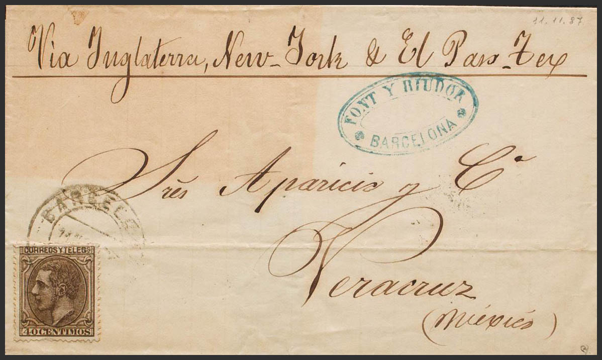 205. 1887. 40 chestnut cts. BARCELONA to VERACRUZ (MEXICO). On the front handwritten "Via Inglaterra, New York and El Paso". MAGNIFICENT AND RARE, POSTAGE OF 40 CTS ACCORDING TO RATE OF AUGUST 1881. Ex-Blight.