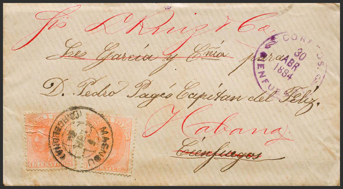 210(2). 1882. 15 orange cts, two stamps. EL MASNOU (BARCELONA) to CIENFUEGOS (CUBA), and forwarded to HAVANA. Clover postmark MASNOU / (BARCELONA). MAGNIFICENT AND UNUSUAL DESTINATION. Ex-Blight.