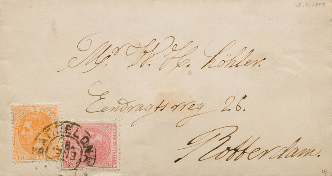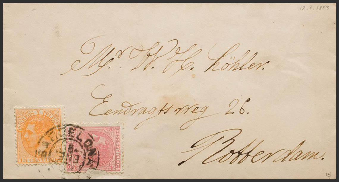 210, 202. 1883. 15 cts orange and 10 cts pink (insignificant original defect). BARCELONA to ROTTERDAM (NETHERLANDS). MAGNIFICENT AND UNUSUAL DESTINATION. Ex-Blight.