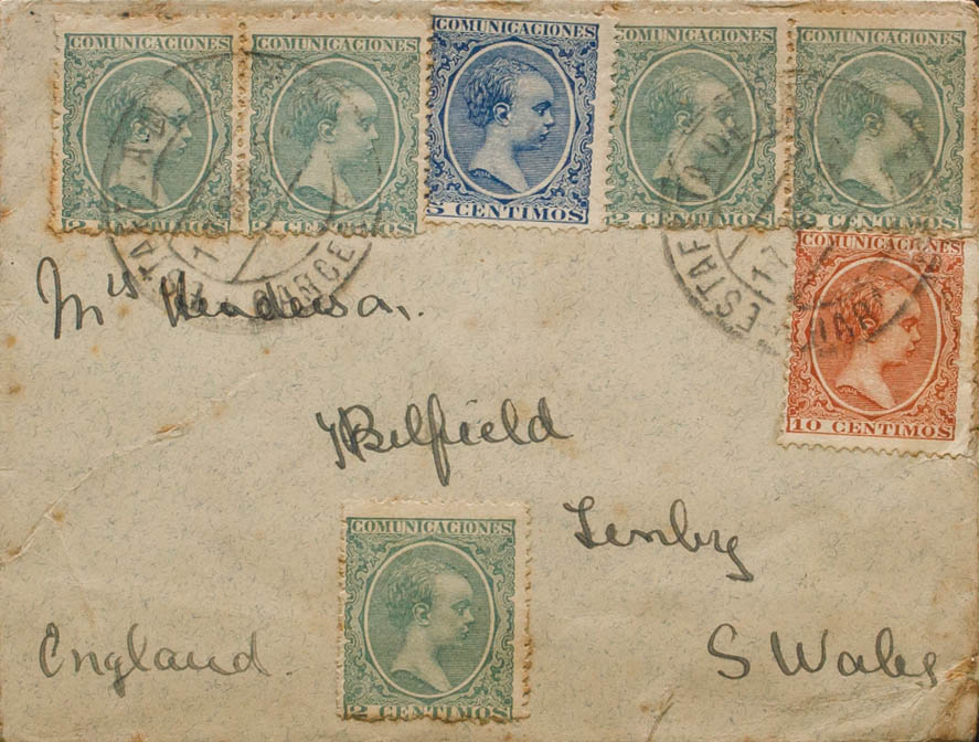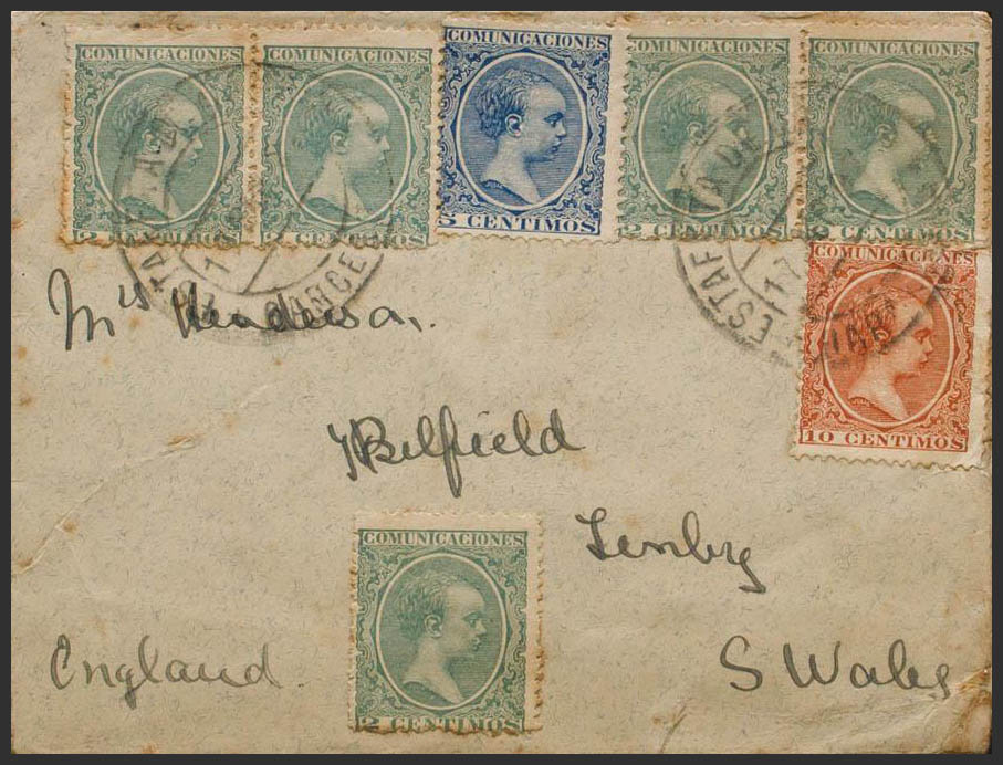 213(5), 215, 217. 1897. 2 cts green, five stamps, 5 cts blue and 10 cts chestnut yellow. BARCELONA to TEMBY (ENGLAND). On the back arrival. MAGNIFICENT AND SPECTACULAR POSTAGE. Ex-Blight.