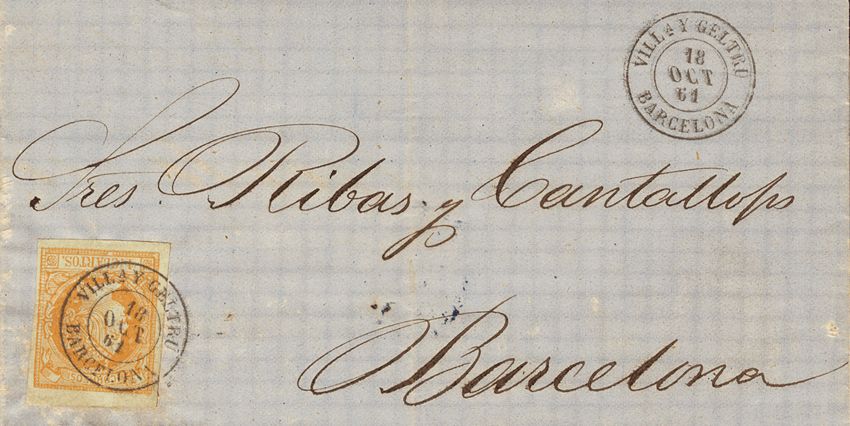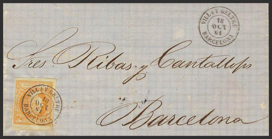 52. 1860. 4 cuartos yellow. VILLª AND GELTRU to BARCELONA. Postmark VILLª Y GELTRU / BARCELONA. MAGNIFICENT.