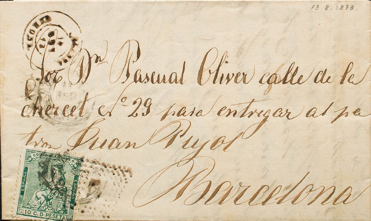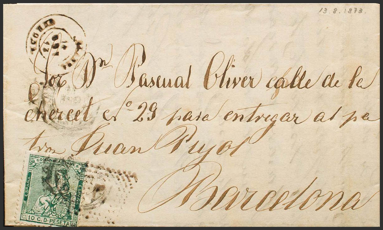 133. 1873. 10 green cts BLANES to BARCELONA. On the front dater BLANES / GERONA. Ex-Blight.