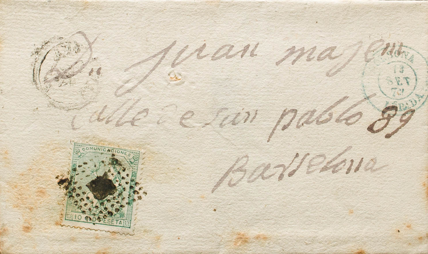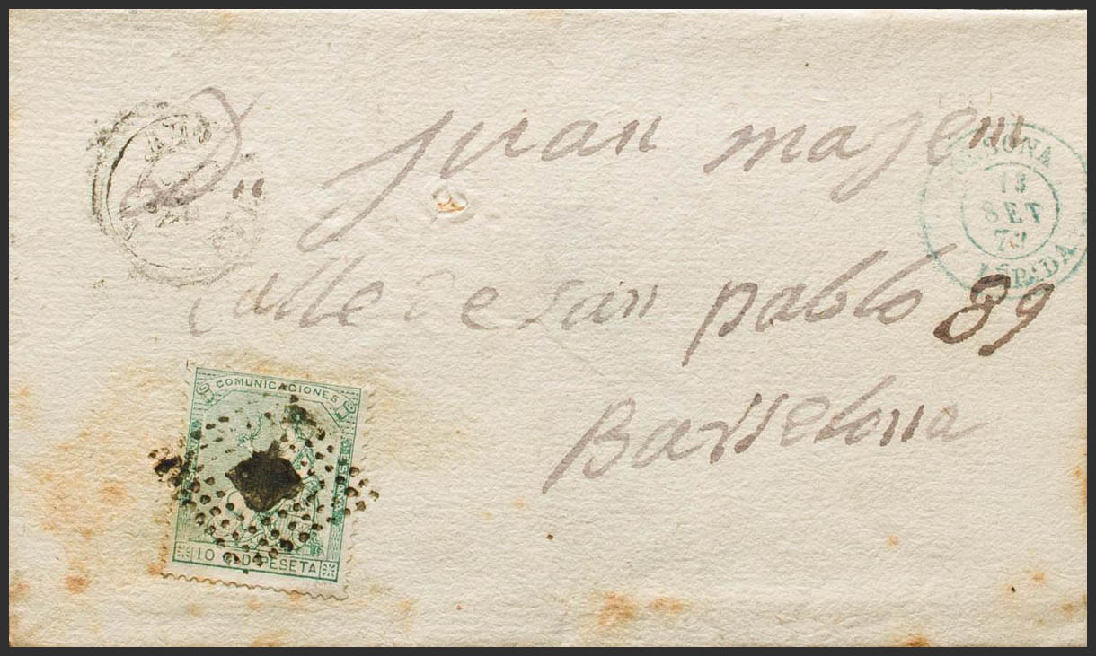 133. 1873. 10 cts green. SOLSONA to BARCELONA. On the front date SOLSONA / LERIDA, in blue. MAGNIFICENT. Ex-Blight.