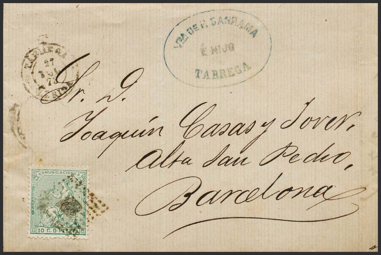 133. 1873. 10 cts green. TARREGA to BARCELONA. On the front dater TARREGA / LERIDA. Ex-Blight.