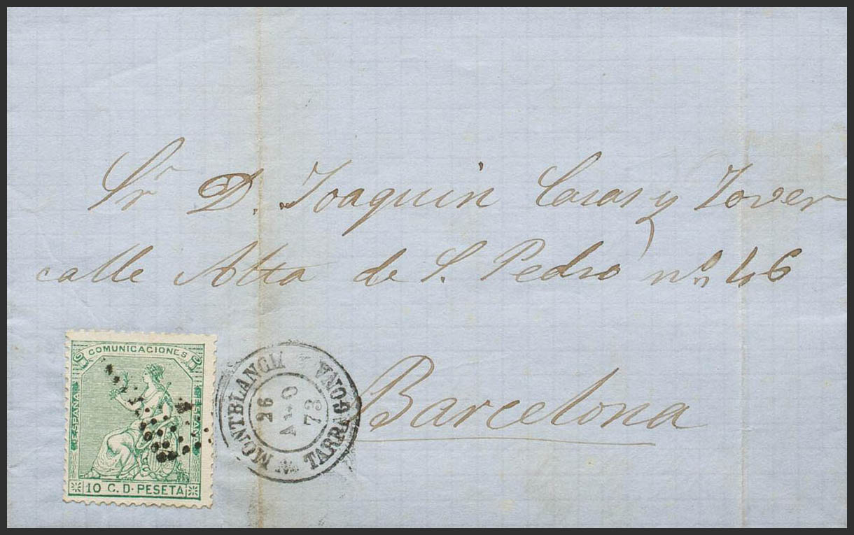 133. 1873. 10 cts green. MONTBLANCH to BARCELONA. On the front dater MONTBLANCH / TARRAGONA. MAGNIFICENT. Ex-Blight.