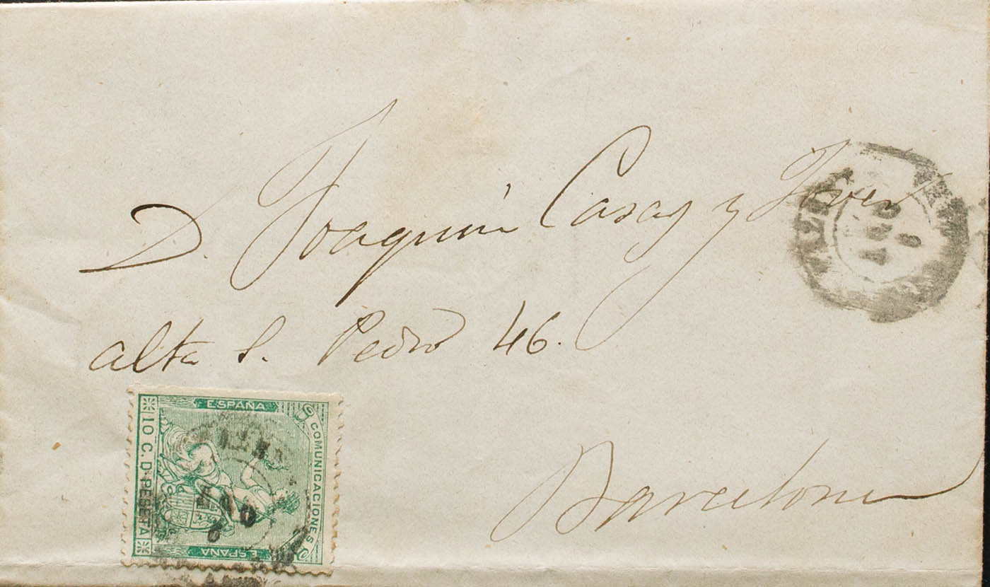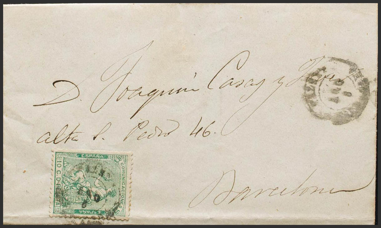 133. 1873. 10 cts green. FALSET to BARCELONA. Postmark FALSET / TARRAGONA. MAGNIFICENT AND RARE. Ex-Blight.