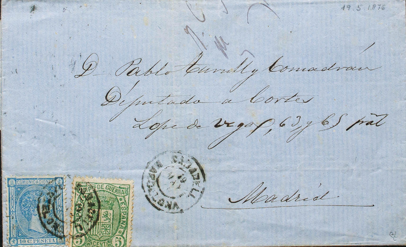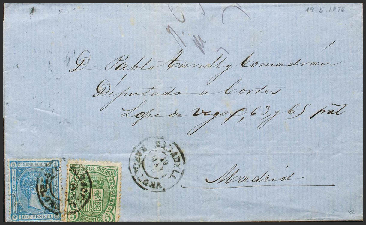164, 154. 1876. 10 cts blue and 5 cts green. SABADELL to MADRID. Postmark SABADELL / BARCELONA. MAGNIFICENT. Ex-Blight.