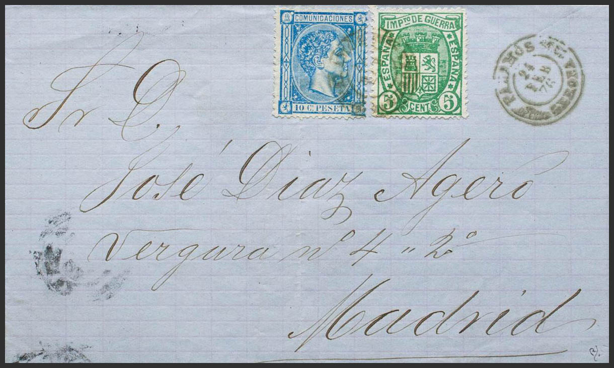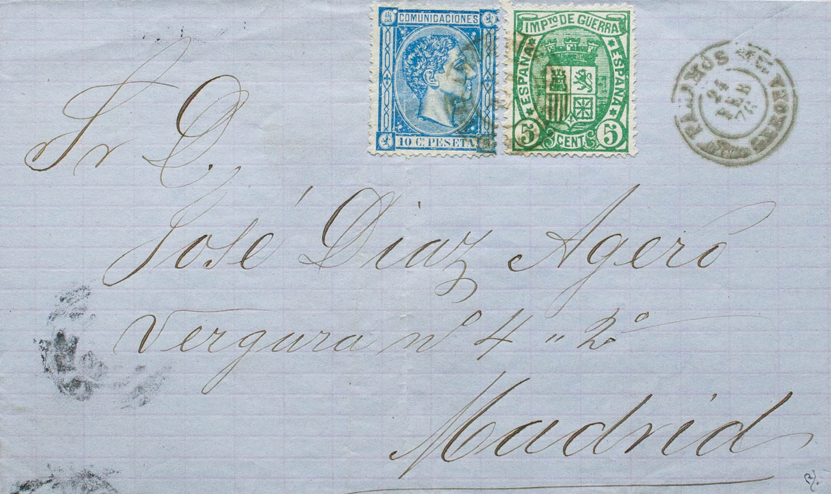 164, 154. 1876. 10 cts blue (file fold) and 5 cts green. PALAMOS to MADRID. Postmark PALAMOS / GERONA. BEAUTIFUL AND VERY RARE. Ex-Blight.