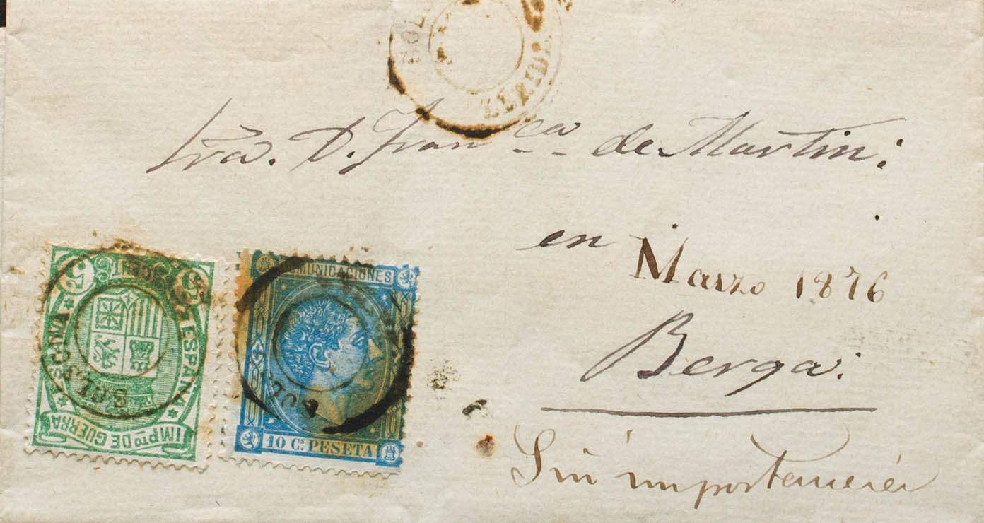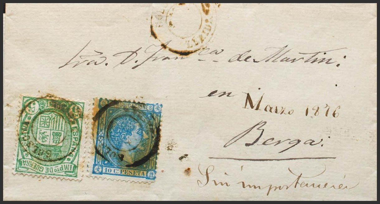 164, 154. 1876. 10 cts blue and 5 cts green. SOLSONA to BERGA. Postmark SOLSONA / LERIDA, without date block, therefore the date is indicated on the front in handwritten form and annotation "without importance". MAGNIFICENT AND RARE. Ex-Blight.