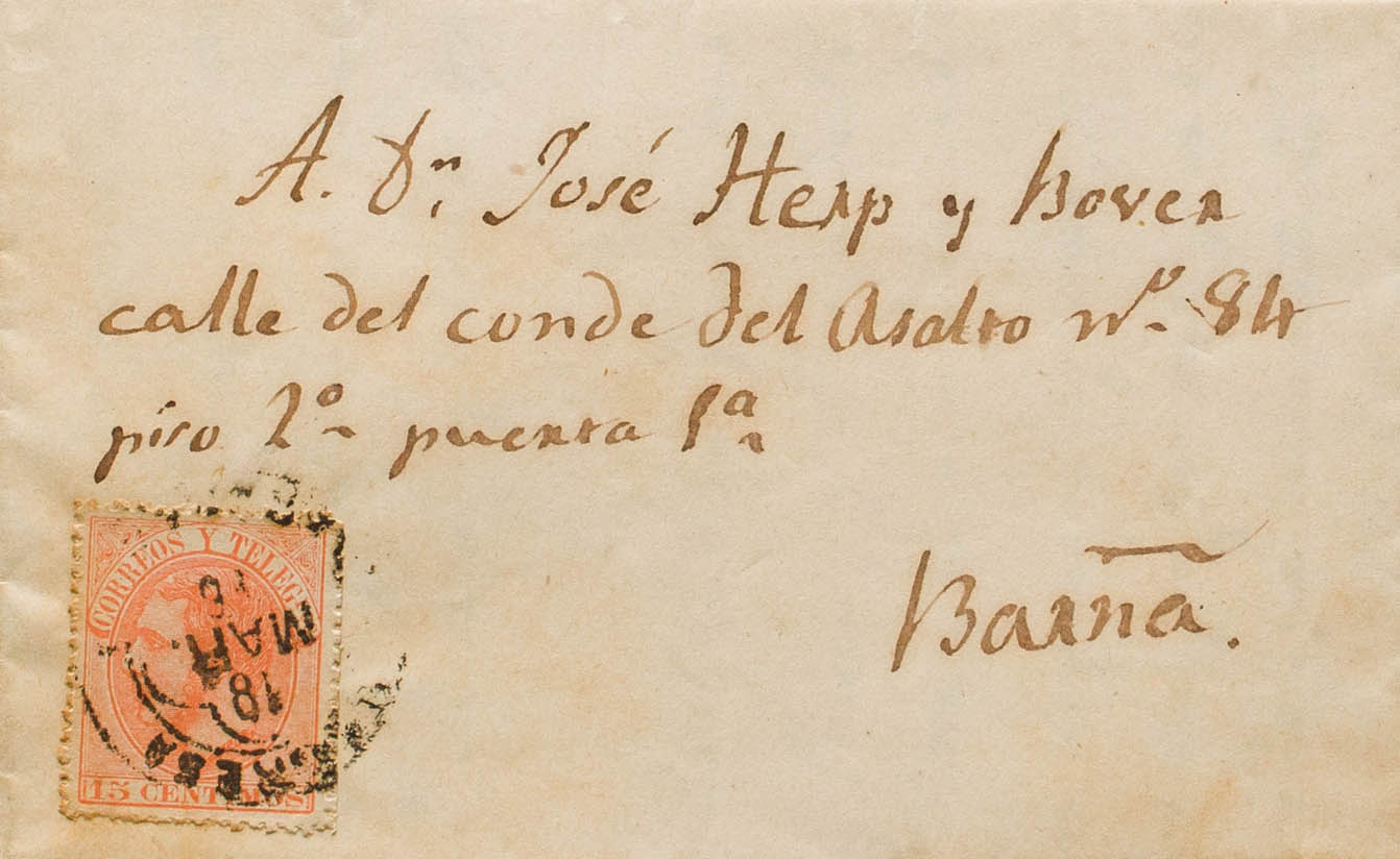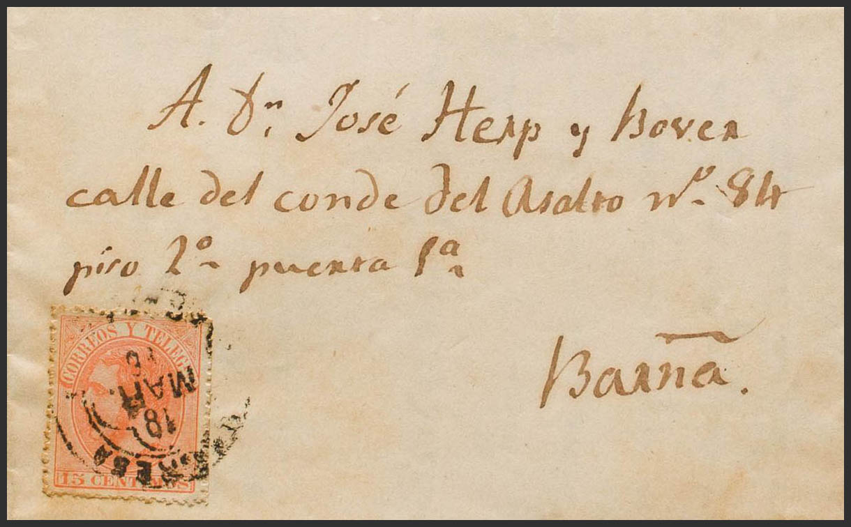 210. 1886. 15 orange cts. ARTS to BARCELONA. Clover postmark MANRESA / BARCELONA. MAGNIFICENT. Ex-Blight.