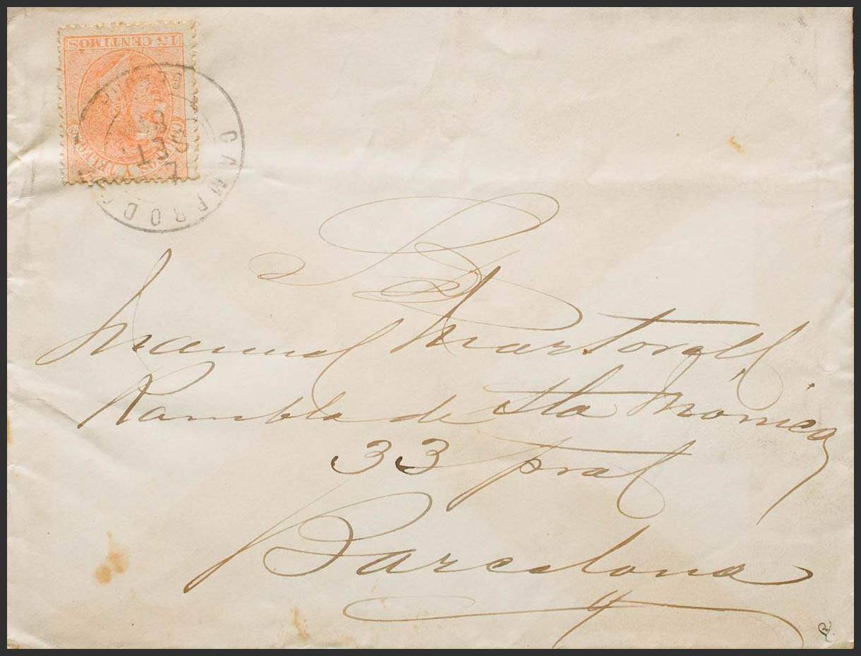 210. 1884. 15 orange cts. CAMPRODON to BARCELONA. Clover postmark CAMPRODON / GERONA. MAGNIFICENT AND RARE. Ex-Blight.