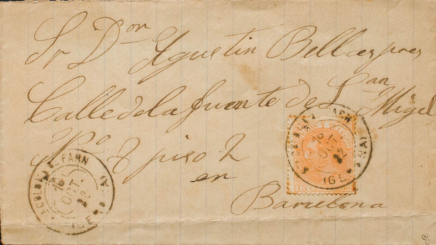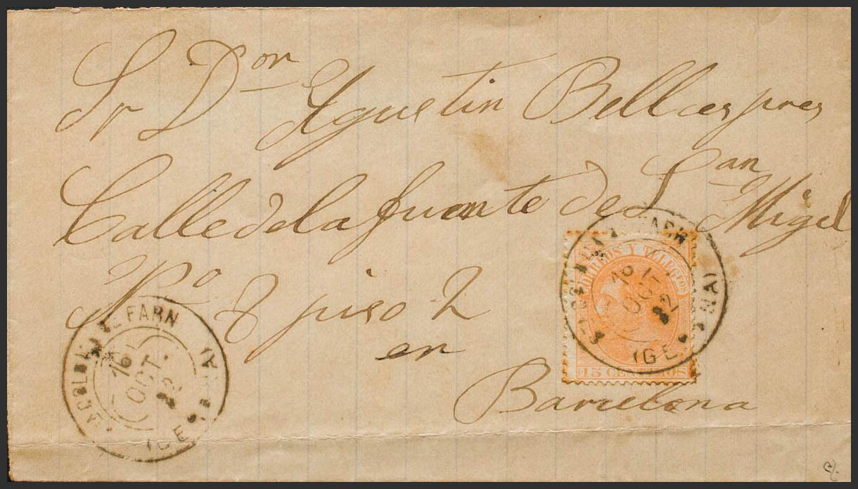 210. 1882. 15 orange cts. SANTA COLOMA DE FARNES to BARCELONA (partially involved). Clover postmark Sª COLOMA DE FARN. / (GERONA). MAGNIFICENT. Ex-Blight.