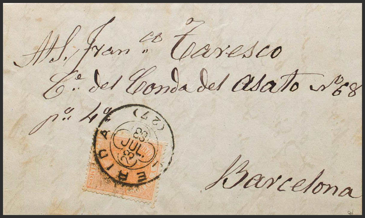 210. 1883. 15 orange cts. LERIDA to BARCELONA. Clover postmark LERIDA / (27). MAGNIFICENT. Ex-Blight.