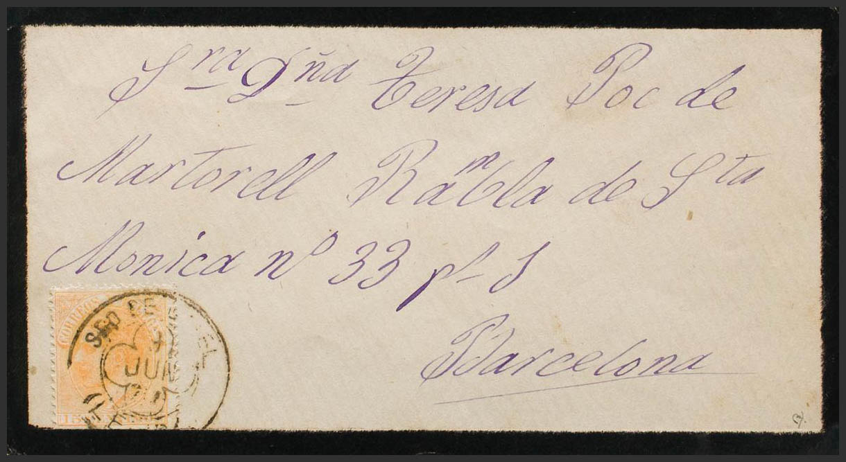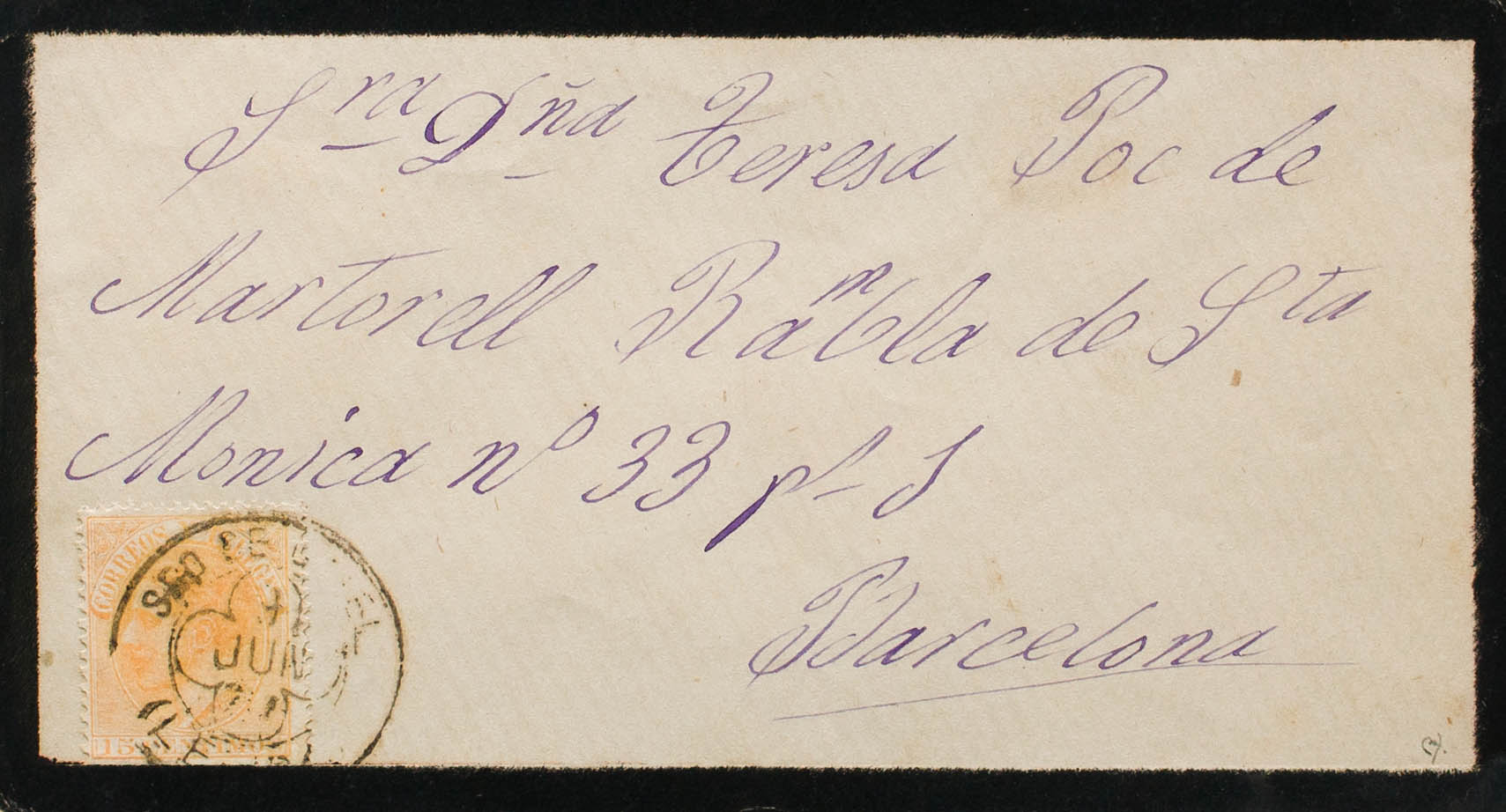 210. 1884. 15 orange cts. SEO FROM URGEL to BARCELONA. Clover postmark SEO DE URGEL / (LERIDA). MAGNIFICENT AND RARE. Ex-Blight.