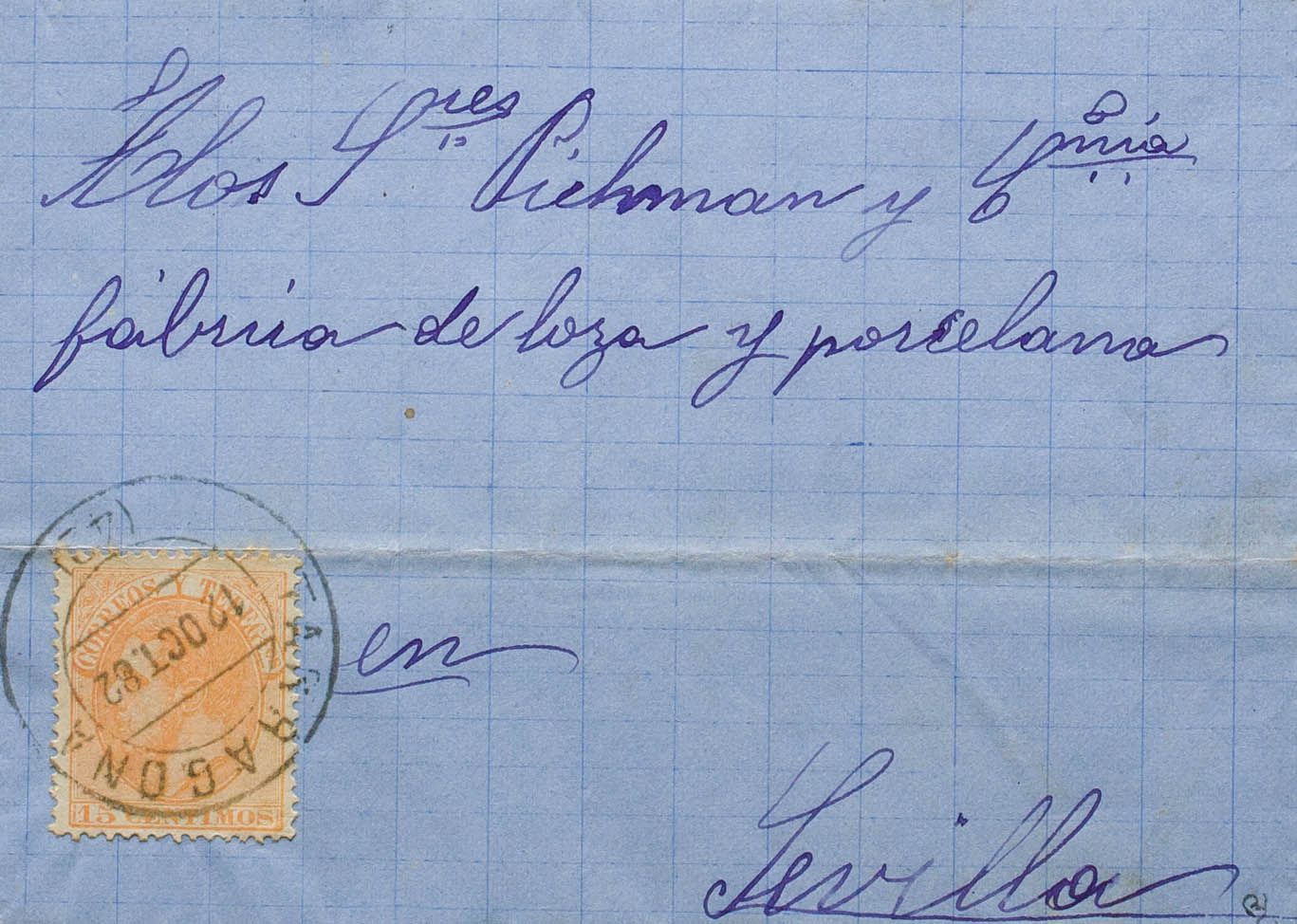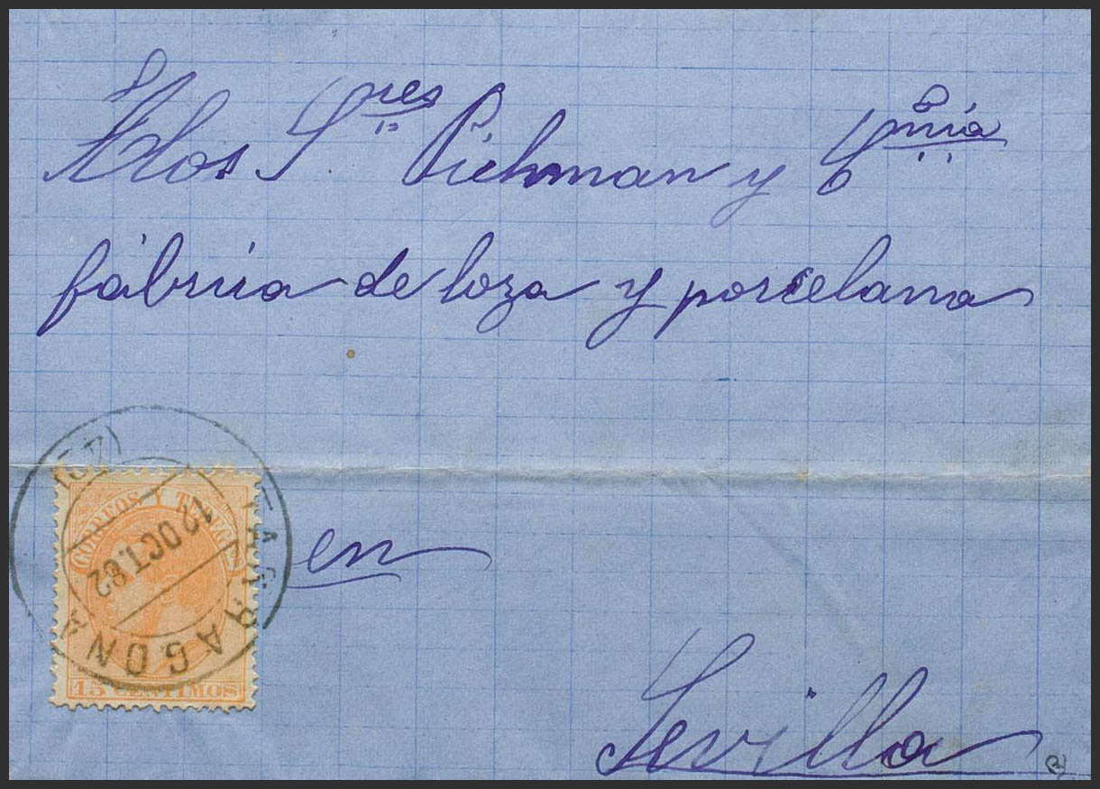 210. 1882. 15 orange cts. TARRAGONA to SEVILLE. Postmark TARRAGONA / (42). MAGNIFICENT. Ex-Blight.