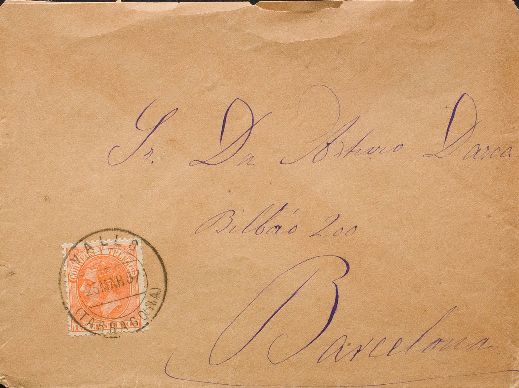 210. 1887. 15 orange cts. VALLS to BARCELONA. Postmark VALLS / (TARRAGONA). MAGNIFICENT. Ex-Blight.